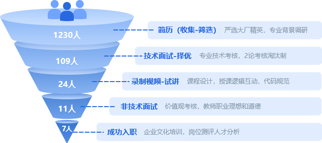 黑马讲师必须经过简历筛选、技术初试、技术复试、录屏试讲、非技术面试(价值观考核)、入职培训六大环节,各环节层层把关